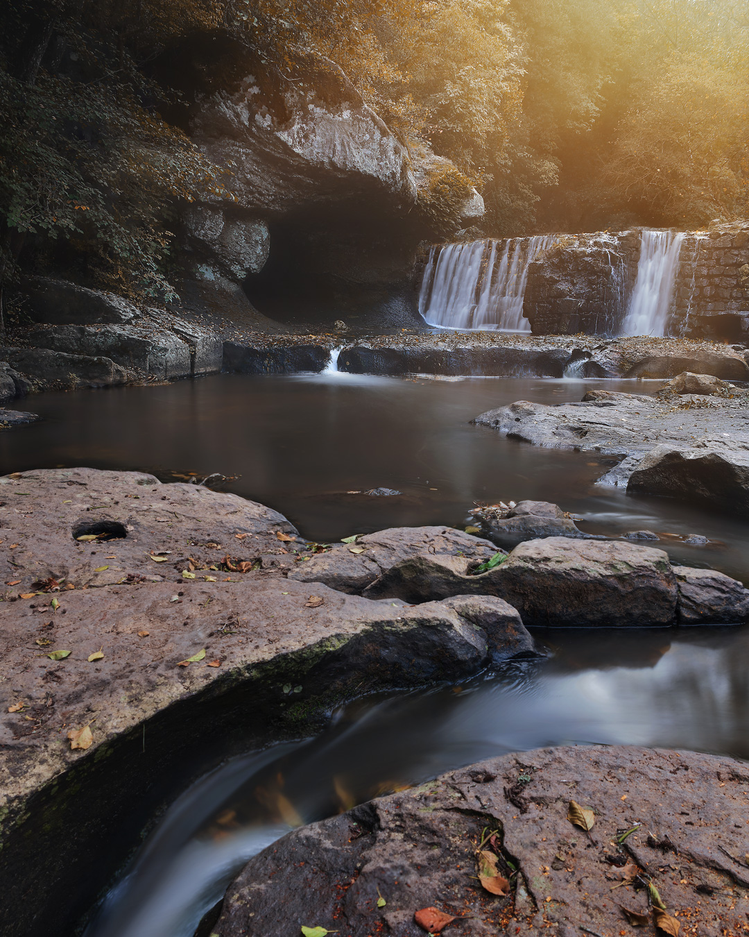 Due to the particular shape of the rocks that make up the area, the waterfall forms a series of various vessels comunicating with each other. I composed the foreground to be closely as possible and the flow of water